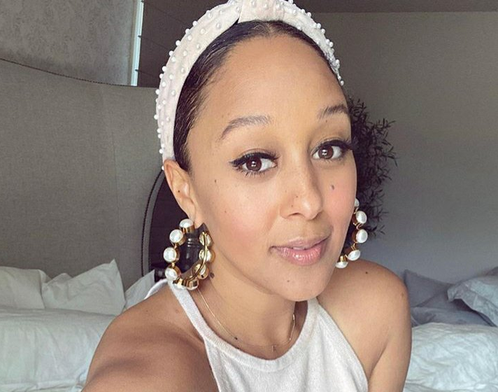 2. Chic and elegant, look at the elegant Tamera Mowry in a white pearl studded top knot headband.
