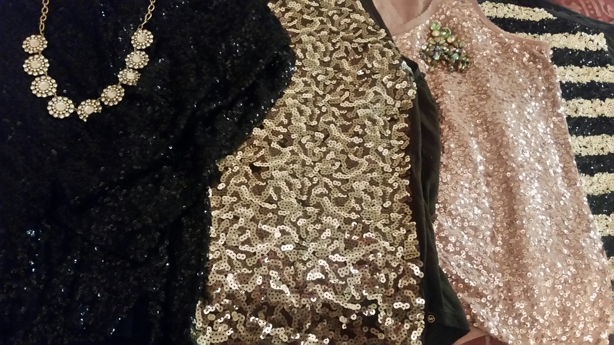left to right: J.Crew sequin long-sleeve tee, Michael Kors multi color tank, J.Crew pink sequin tank, J.Crew black and ivory sequin tank